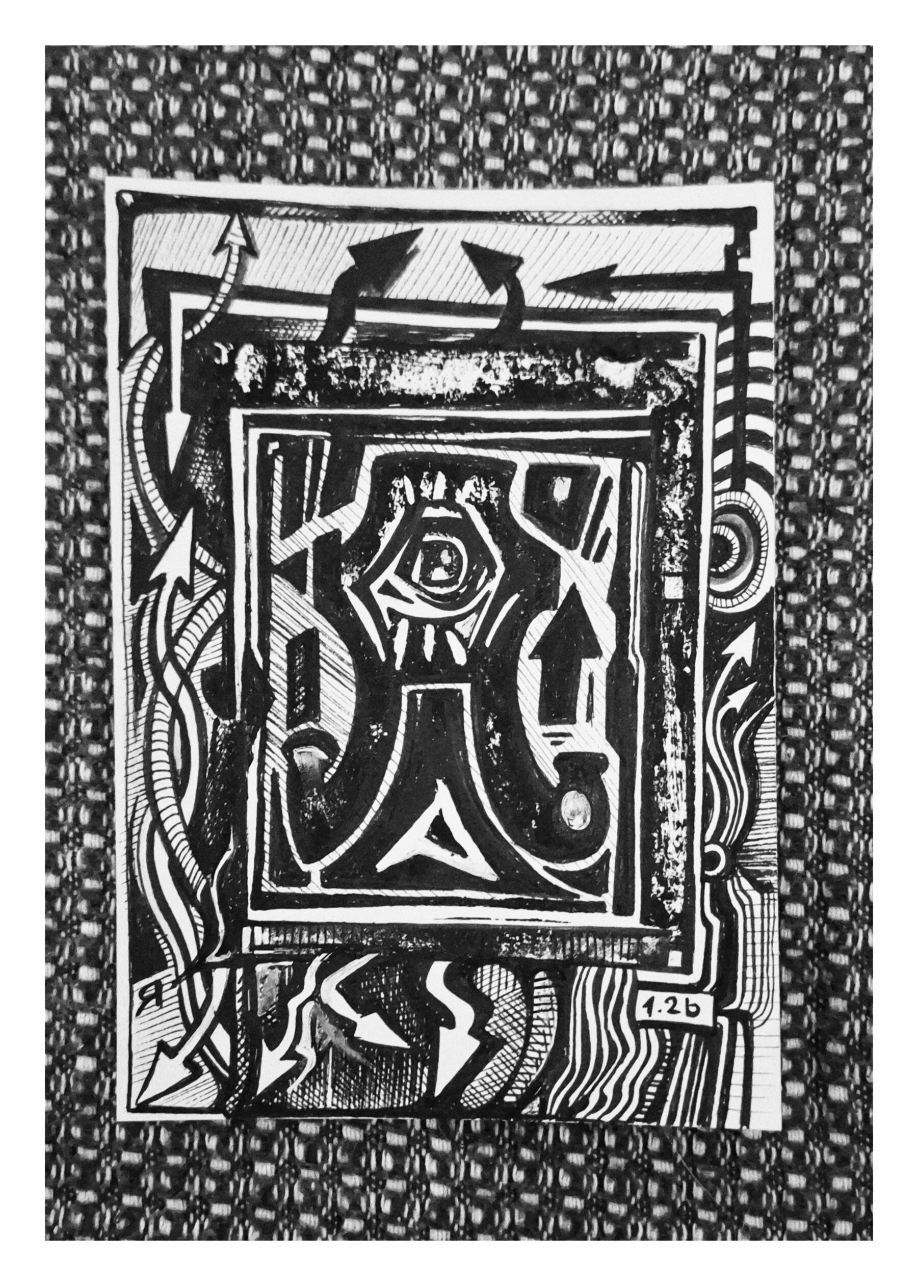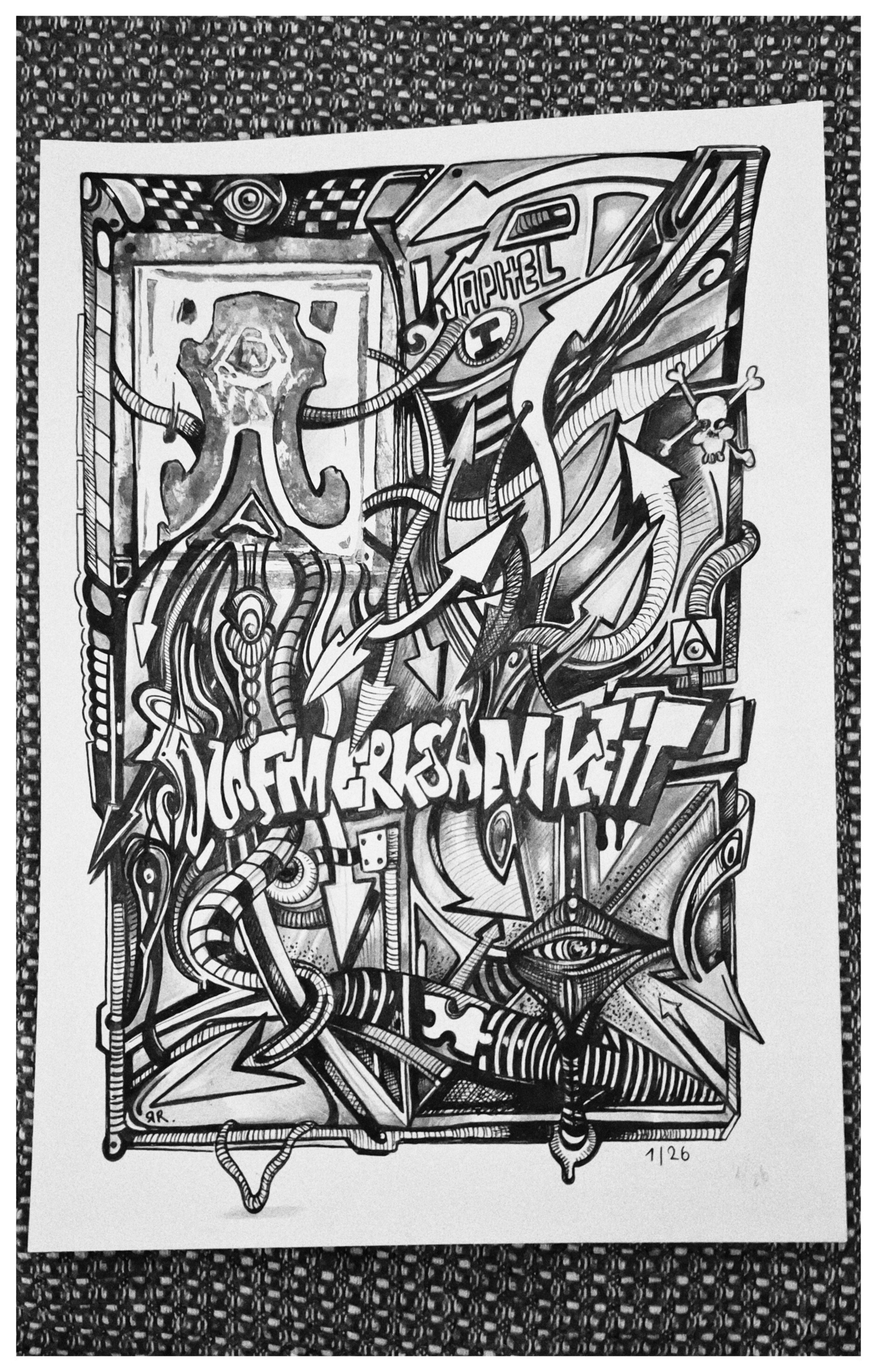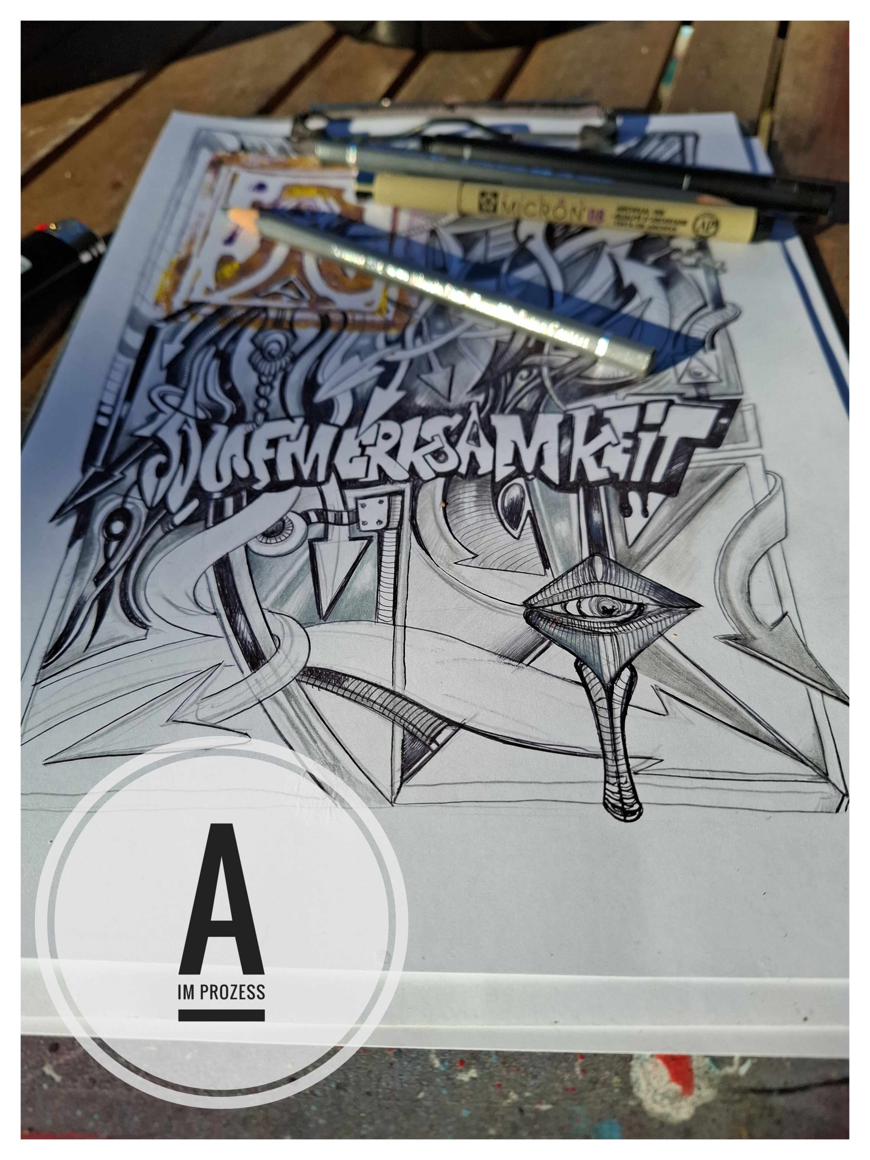 Ein dichtes, schwarz‑weisses Geflecht aus Linien, Symbolen und technischen Fragmenten. Das zentrale Wort AUFMERKSAMKEIT wirkt wie ein visueller Weckruf inmitten eines urbanen Informationsstroms. Augenähnliche Formen und modulare Strukturen thematisieren Wahrnehmung, Fokus und die Überflutung durch Reize.