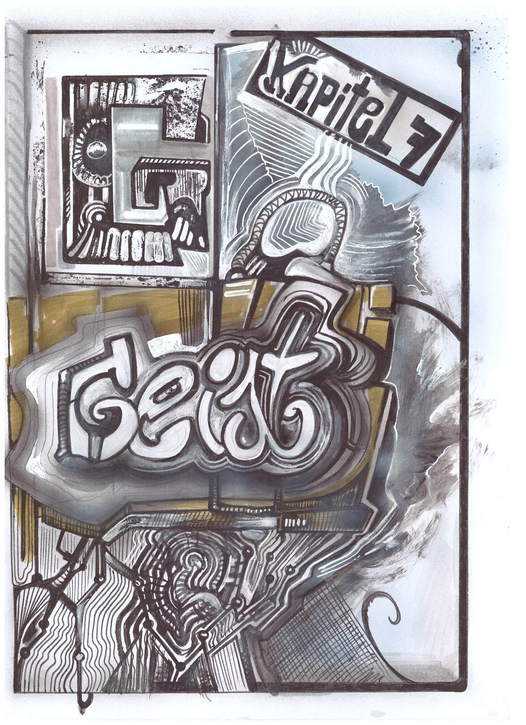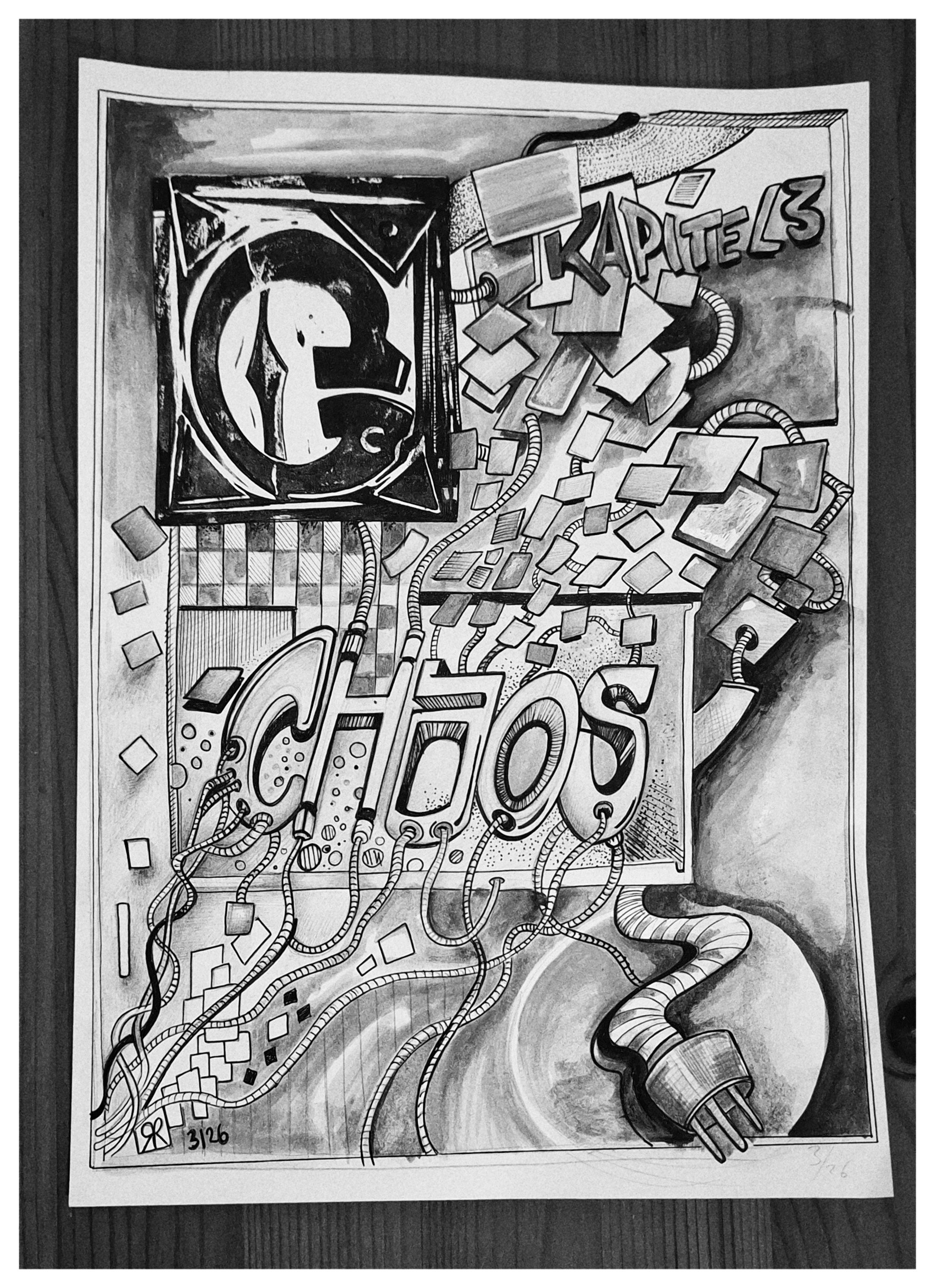 Ein energetisches Geflecht aus Kabeln, Rechtecken und fragmentierten Formen. CHAOS bricht als typografischer Kern aus der Struktur hervor. Die Komposition zeigt ein System am Rand der Überlastung – ein kontrolliertes Durcheinander, das Bewegung, Spannung und kreative Unordnung sichtbar macht.