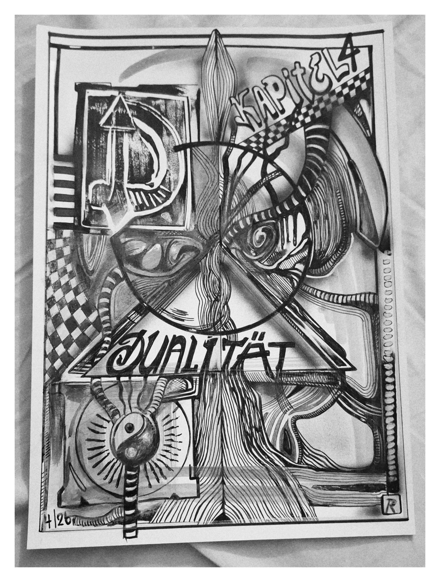 In diesem Werk wird Dualität nicht als einfache Gegenüberstellung verstanden, sondern als dynamisches Spannungsfeld, das sich in Linien, Achsen und symbolischen Fragmenten ausdrückt. Die Zeichnung entfaltet zwei Pole, die sich gegenseitig definieren, herausfordern und erweitern.