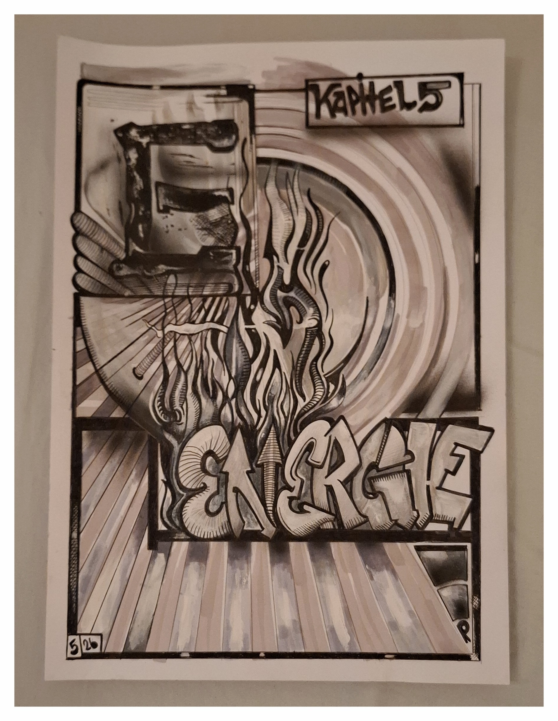 Dieses Werk markiert den fünften Impuls im Zyklus: Energie als Ursprung, Antrieb und transformierende Kraft. Die Zeichnung entfaltet ein visuelles Feld, das von Hitze, Bewegung und innerer Spannung getragen wird. Nichts steht still — alles drängt nach oben, nach außen, nach Weiter.