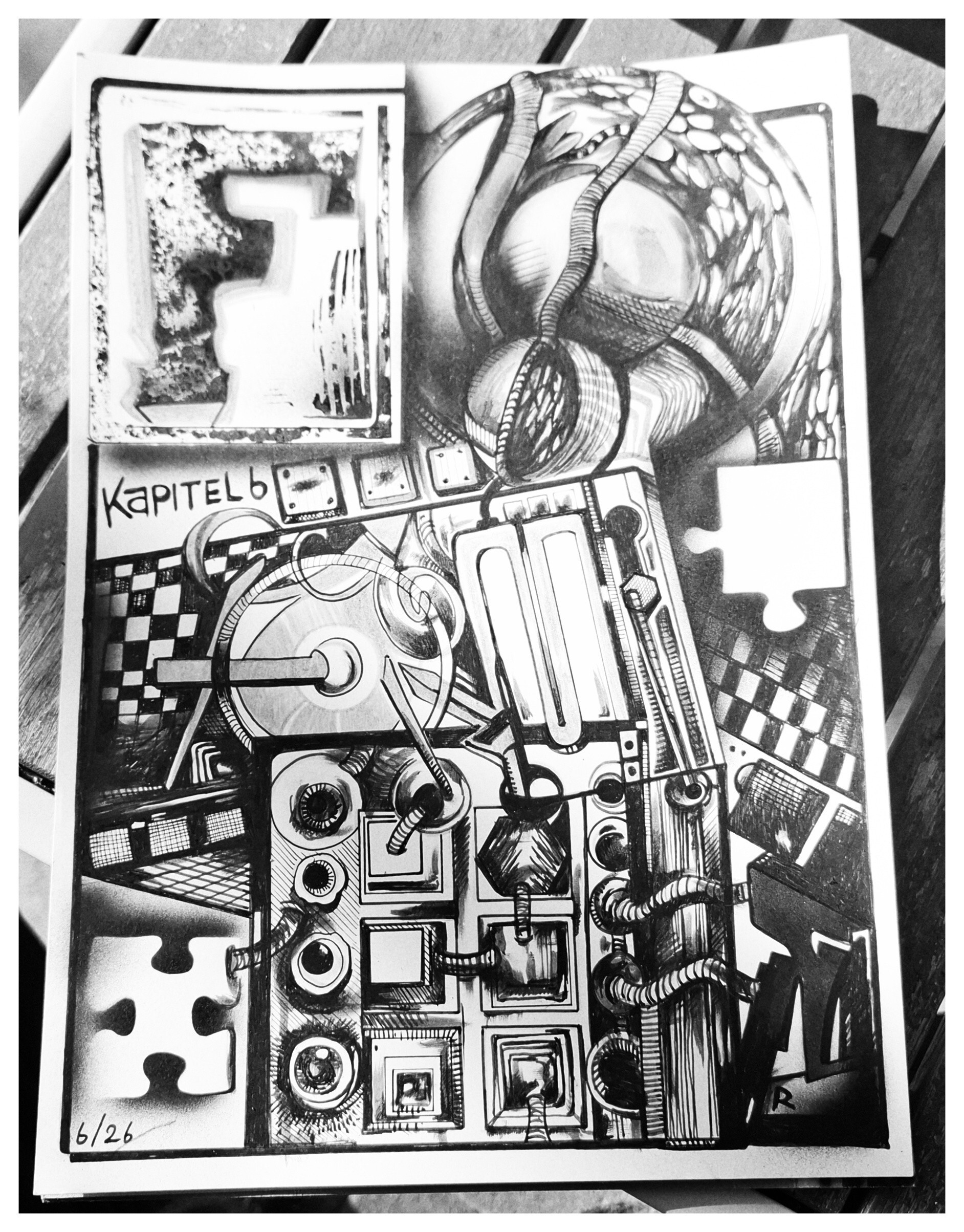 Diese Seite zeigt Form als ein lebendiges Gefüge aus Technik, Organik und Symbol. Im Zentrum steht ein dichtes, vielschichtiges Arrangement aus mechanischen Elementen, Leitungen, Schaltern und strukturellen Fragmenten, das sich wie ein offener Maschinenraum des Denkens entfaltet.